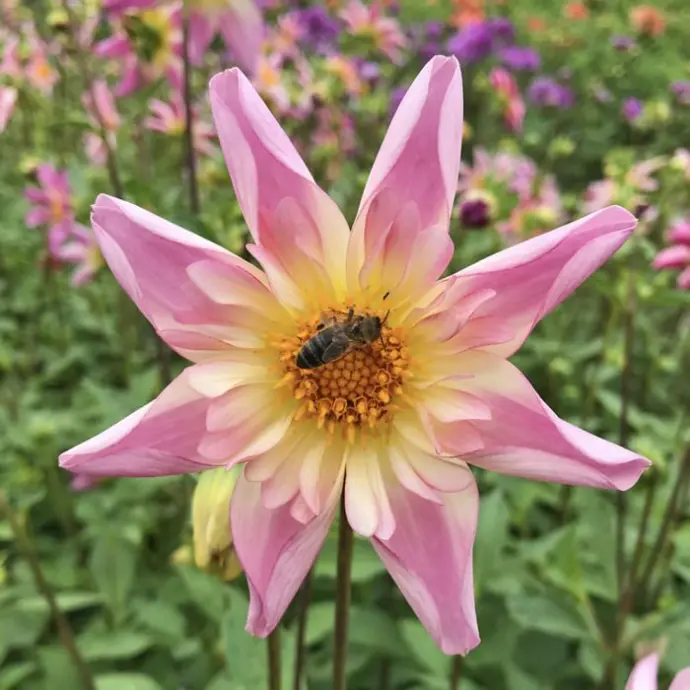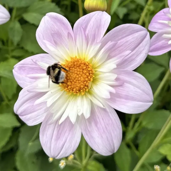 - Bumble Rumble: Deze grote enkelbloemige dahlia is letterlijk een bijen- en vlinder-lokker. Met haar frambozenroze tot witte bloemen en een groot, open geel hart is ze perfect toegankelijk voor bijen.